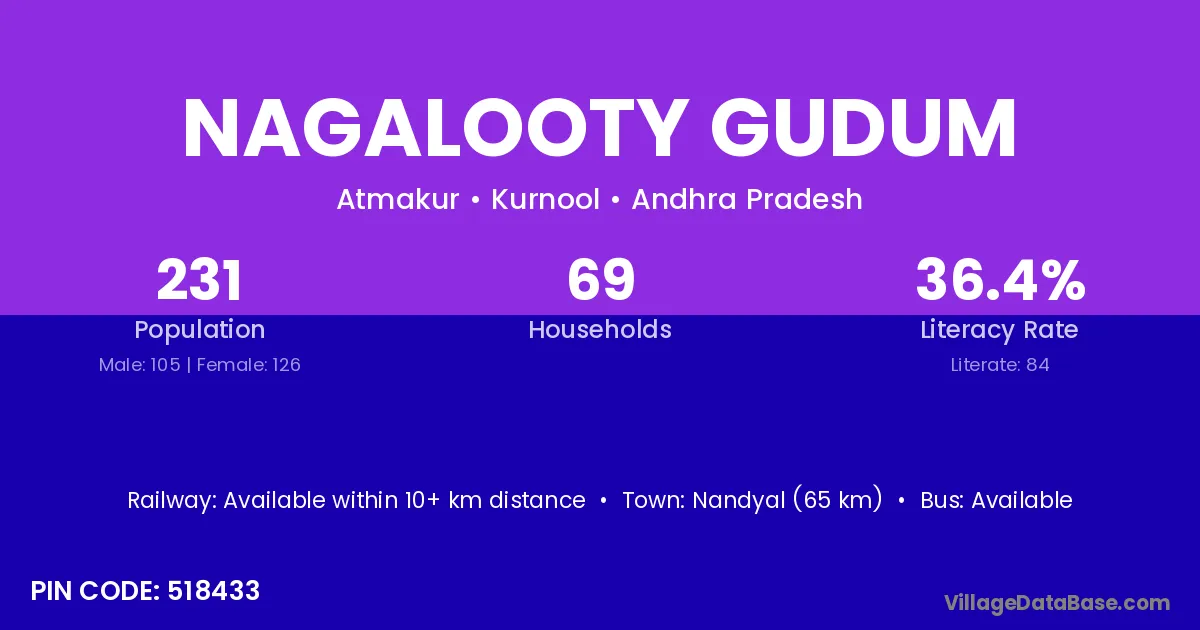 Nandyal (65 km) is the nearest town to Nagalooty Gudum village for major economic activities and is located approximately 65 km away.