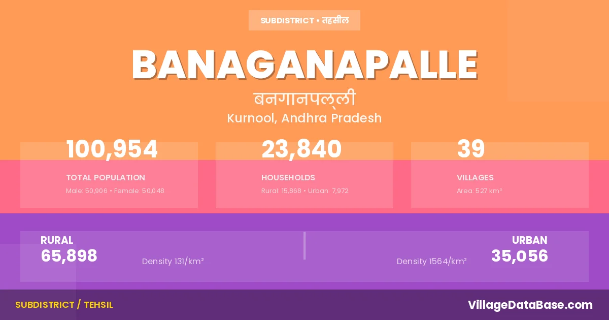 According to the 2011 census The total area of Banaganapalle Mandal is 527 km², with a population of 100954 people. The population density is 192 inhabitants per square kilometre, and there are approximately 23840 houses in the sub district.