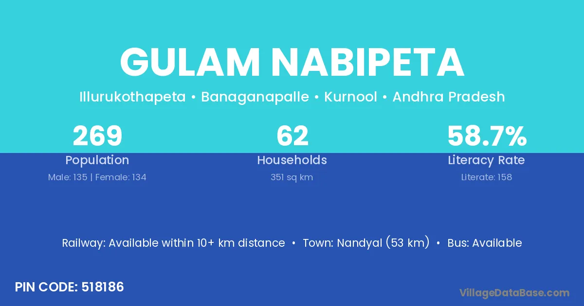 Gulam Nabipeta village has a total population of 269 people, of which 135 are males and 134 are females.