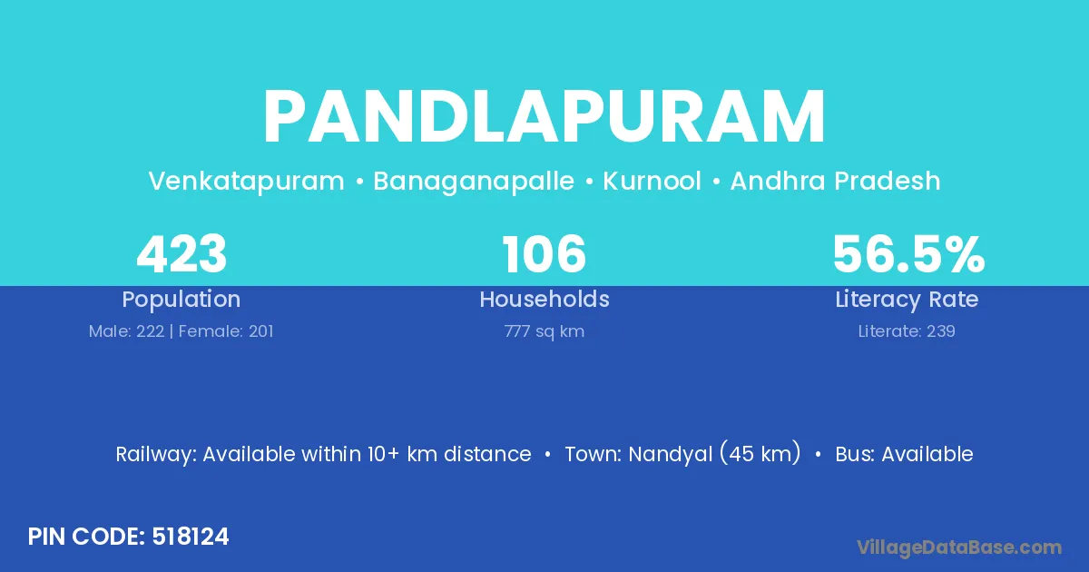 Pandlapuram village has a total population of 423 people, of which 222 are males and 201 are females.