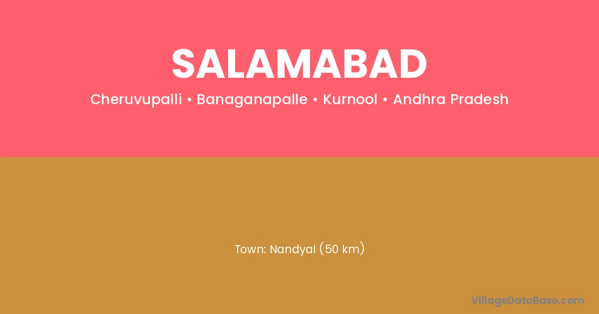 Nandyal (50 km) is the nearest town to Salamabad village for major economic activities and is located approximately 50 km away.