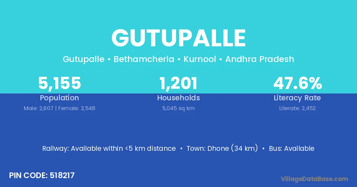 Dhone (34 km) is the nearest town to Gutupalle village for major economic activities and is located approximately 34 km away.