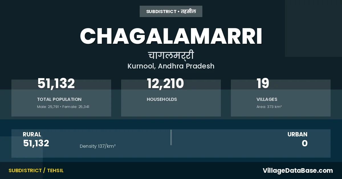 According to the 2011 census The total area of Chagalamarri Mandal is 373 km², with a population of 51132 people. The population density is 137 inhabitants per square kilometre, and there are approximately 12210 houses in the sub district.