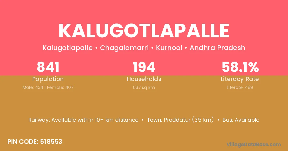 Kalugotlapalle village has a total population of 841 people, of which 434 are males and 407 are females.