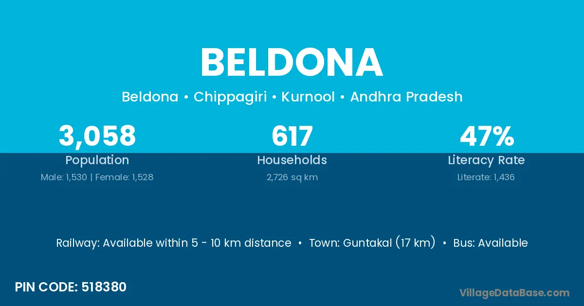 Guntakal (17 km) is the nearest town to Beldona village for major economic activities and is located approximately 17 km away.
