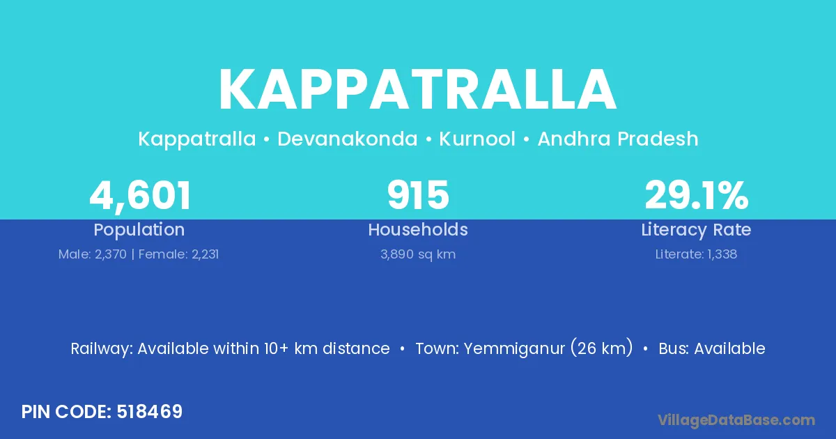Kappatralla village has a total population of 4,601 people, of which 2,370 are males and 2,231 are females.