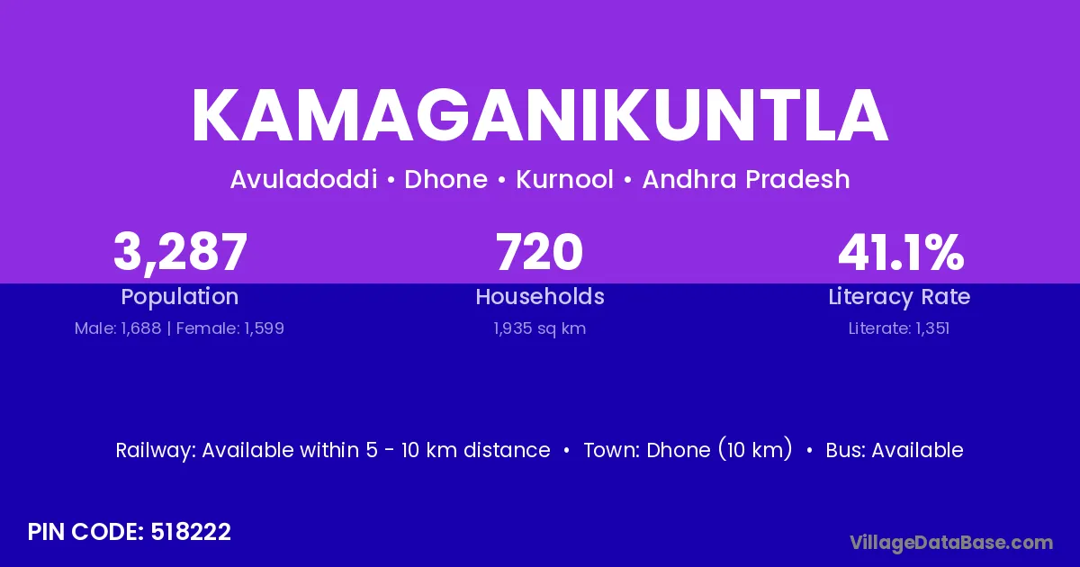 Dhone (10 km) is the nearest town to Kamaganikuntla village for major economic activities and is located approximately 10 km away.