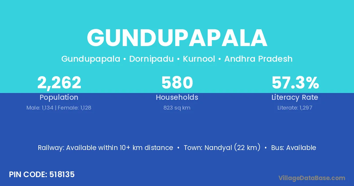 Nandyal (22 km) is the nearest town to Gundupapala village for major economic activities and is located approximately 22 km away.