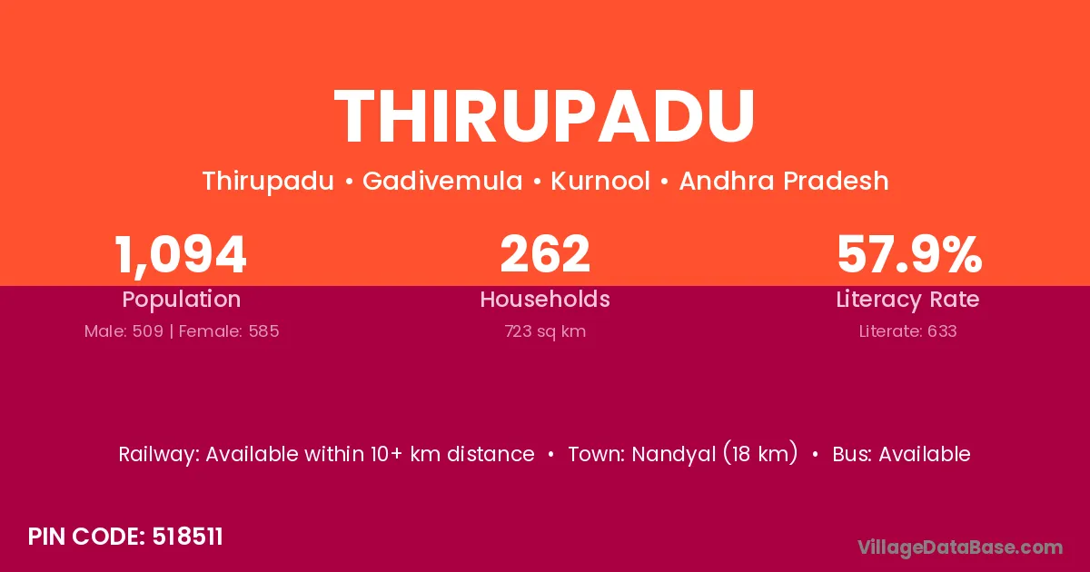 Nandyal (18 km) is the nearest town to Thirupadu village for major economic activities and is located approximately 18 km away.