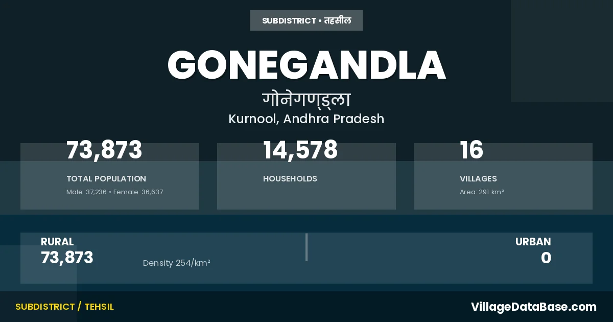 According to the 2011 census The total area of Gonegandla Mandal is 291 km², with a population of 73873 people. The population density is 254 inhabitants per square kilometre, and there are approximately 14578 houses in the sub district.