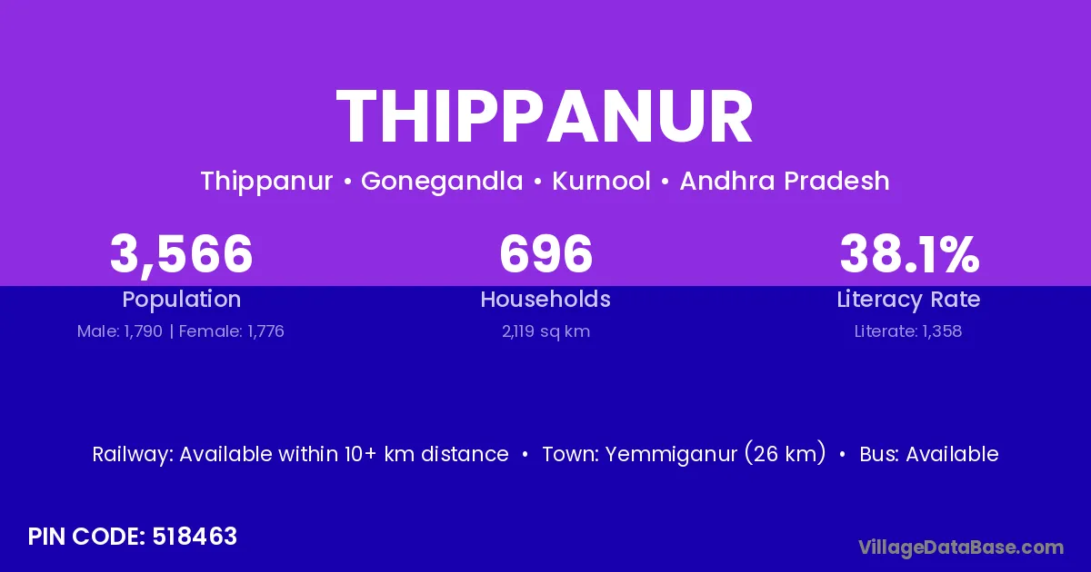 Yemmiganur (26 km) is the nearest town to Thippanur village for major economic activities and is located approximately 26 km away.