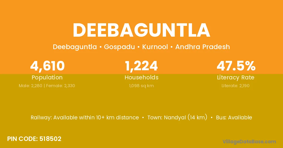 Nandyal (14 km) is the nearest town to Deebaguntla village for major economic activities and is located approximately 14 km away.