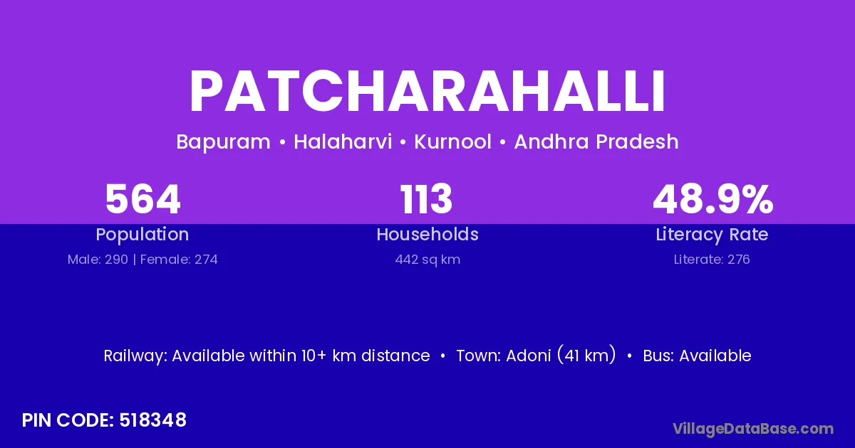 Adoni (41 km) is the nearest town to Patcharahalli village for major economic activities and is located approximately 41 km away.