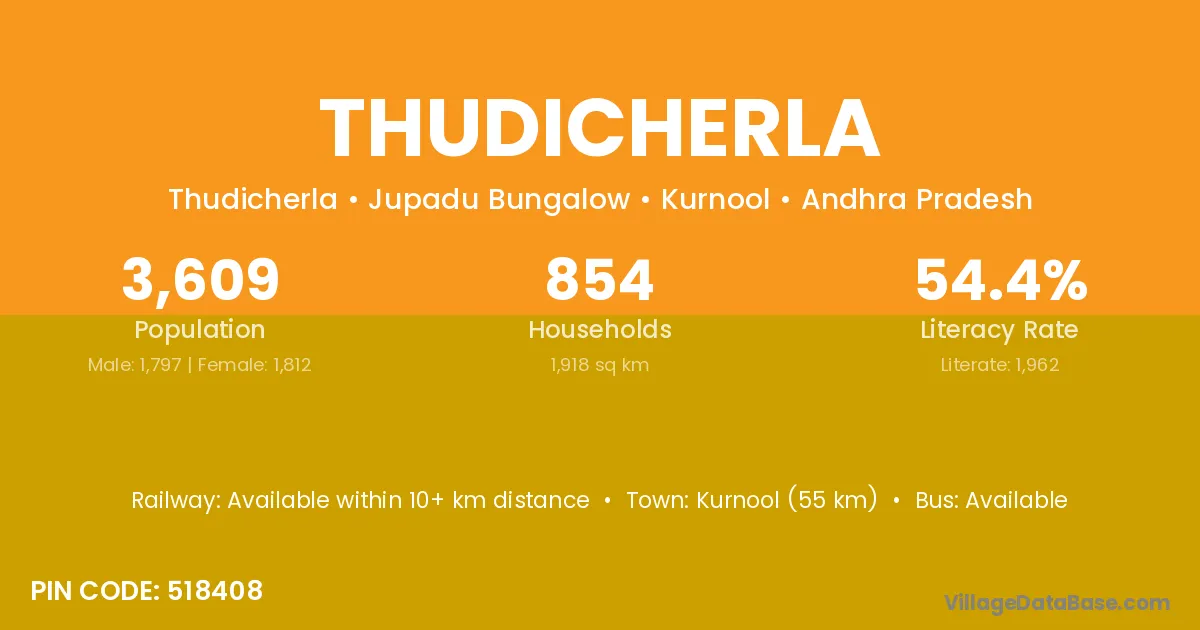Kurnool (55 km) is the nearest town to Thudicherla village for major economic activities and is located approximately 55 km away.