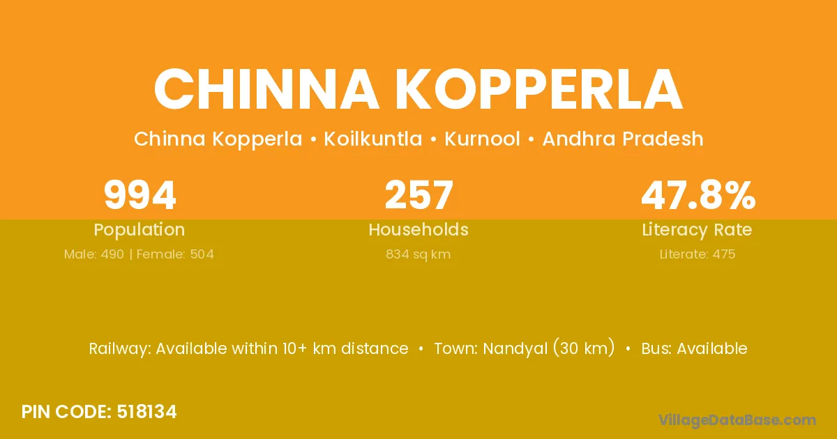 Chinna Kopperla village has a total population of 994 people, of which 490 are males and 504 are females.