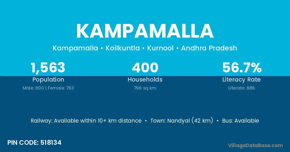 Nandyal (42 km) is the nearest town to Kampamalla village for major economic activities and is located approximately 42 km away.