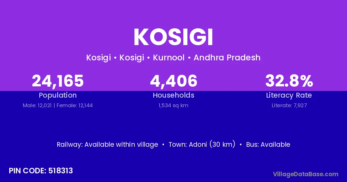 Adoni (30 km) is the nearest town to Kosigi village for major economic activities and is located approximately 30 km away.