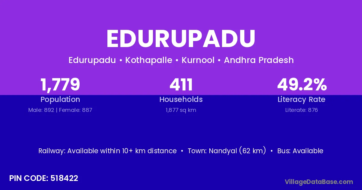 Nandyal (62 km) is the nearest town to Edurupadu village for major economic activities and is located approximately 62 km away.