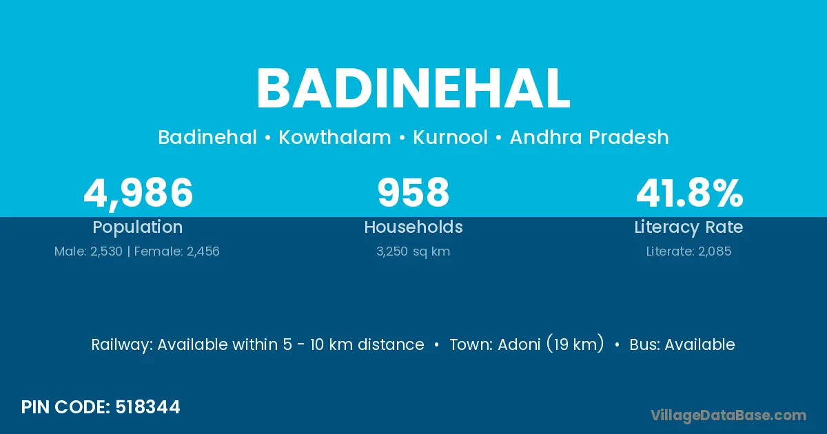 Adoni (19 km) is the nearest town to Badinehal village for major economic activities and is located approximately 19 km away.