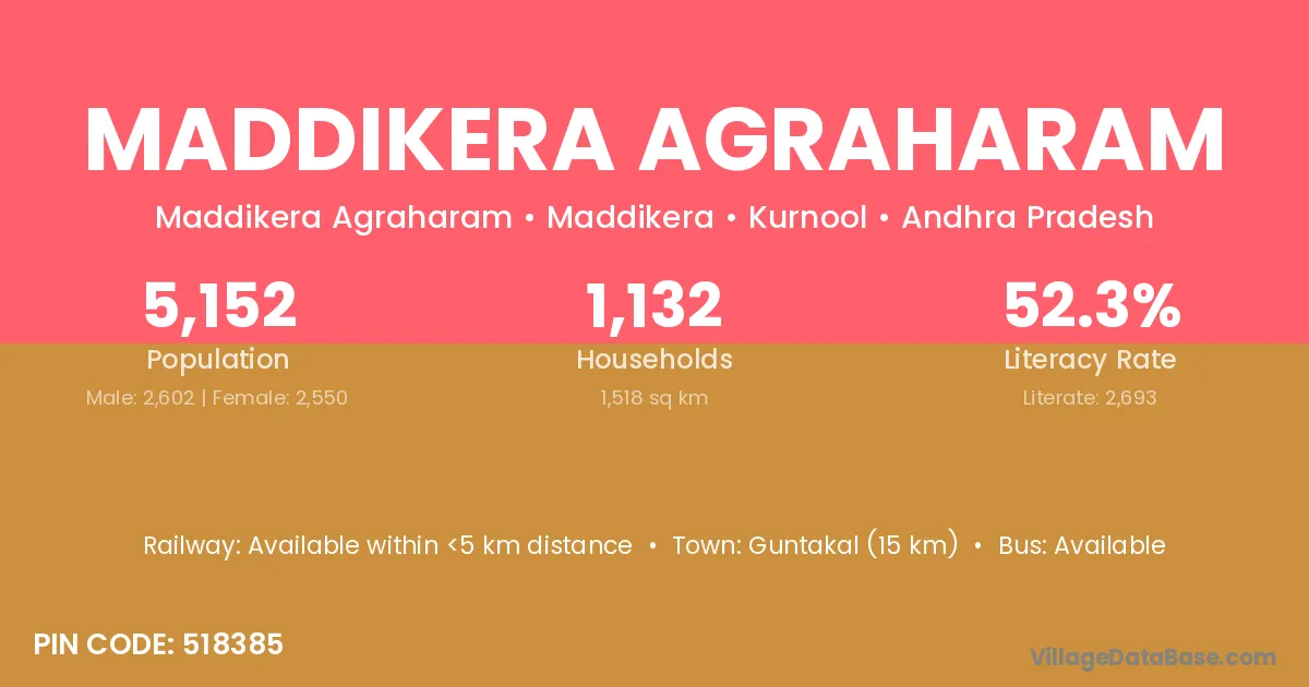 Guntakal (15 km) is the nearest town to Maddikera Agraharam village for major economic activities and is located approximately 15 km away.
