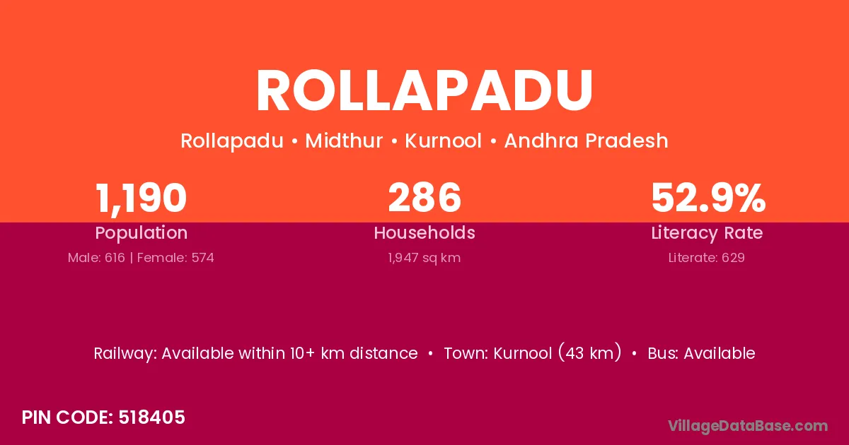 Rollapadu village has a total population of 1,190 people, of which 616 are males and 574 are females.