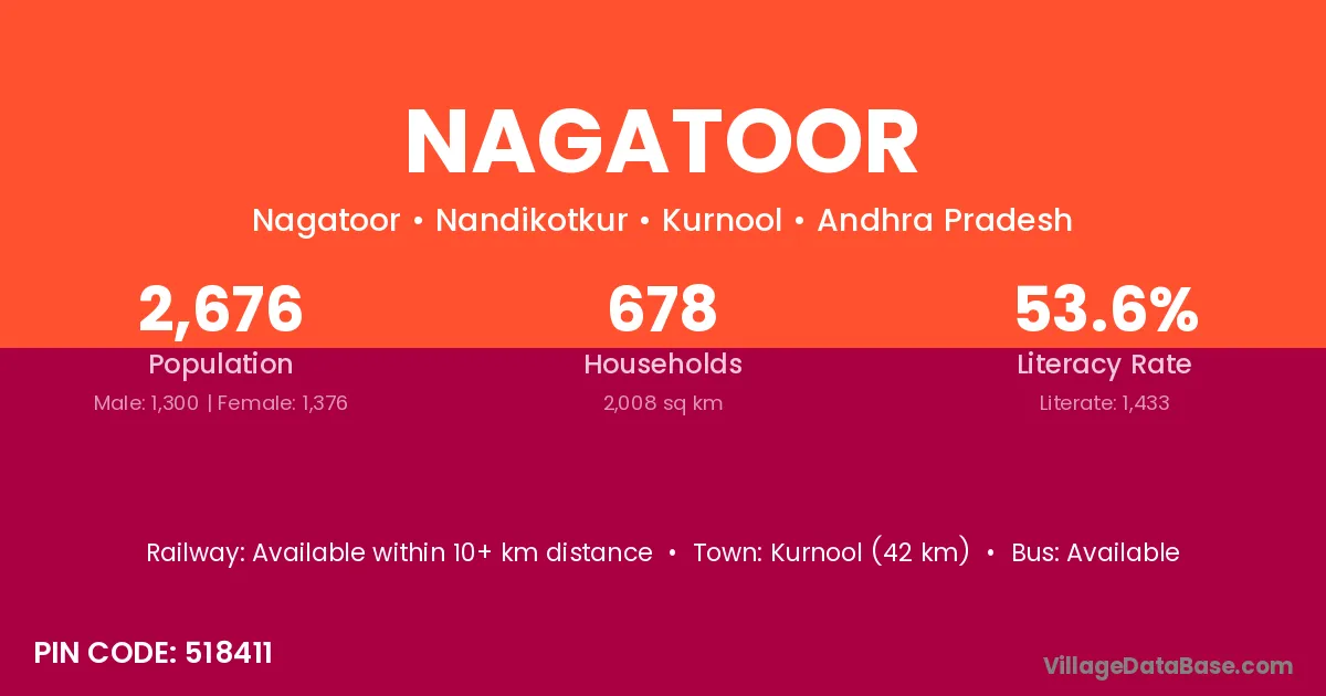 Kurnool (42 km) is the nearest town to Nagatoor village for major economic activities and is located approximately 42 km away.