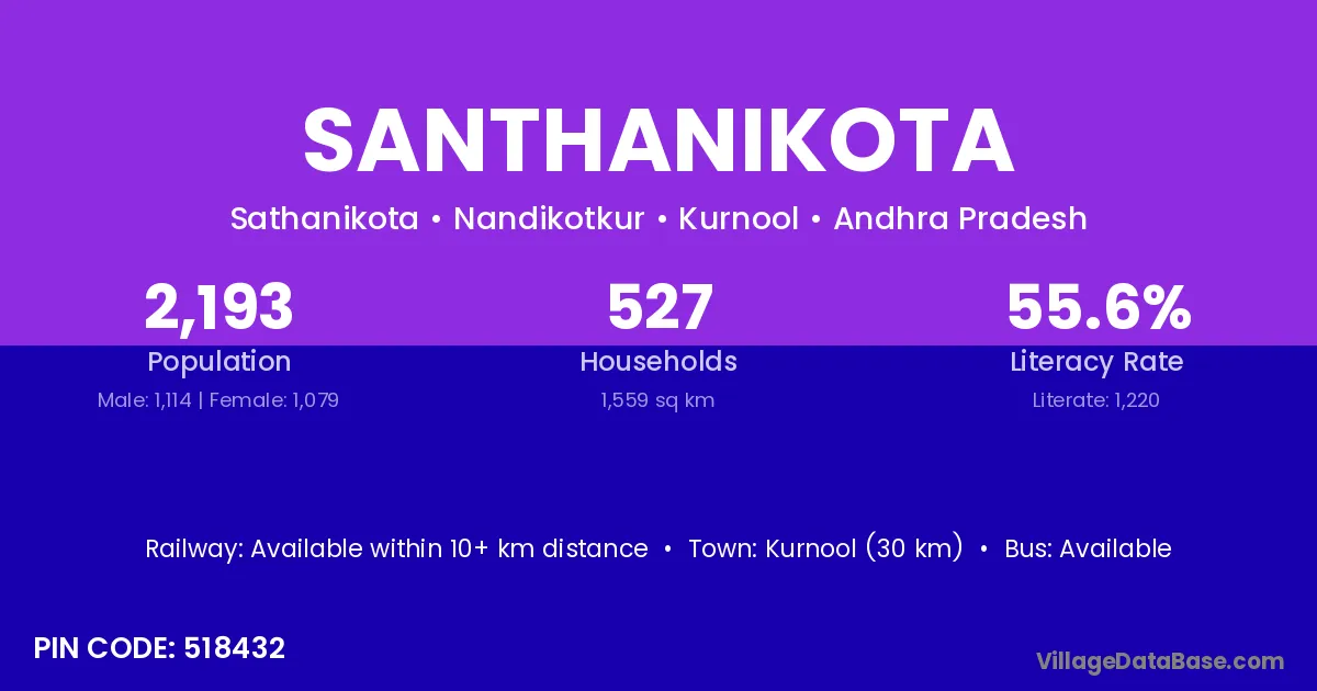 Kurnool (30 km) is the nearest town to Santhanikota village for major economic activities and is located approximately 30 km away.