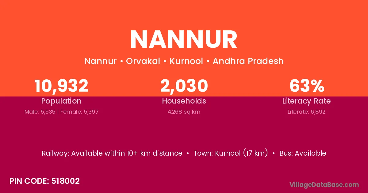 Kurnool (17 km) is the nearest town to Nannur village for major economic activities and is located approximately 17 km away.