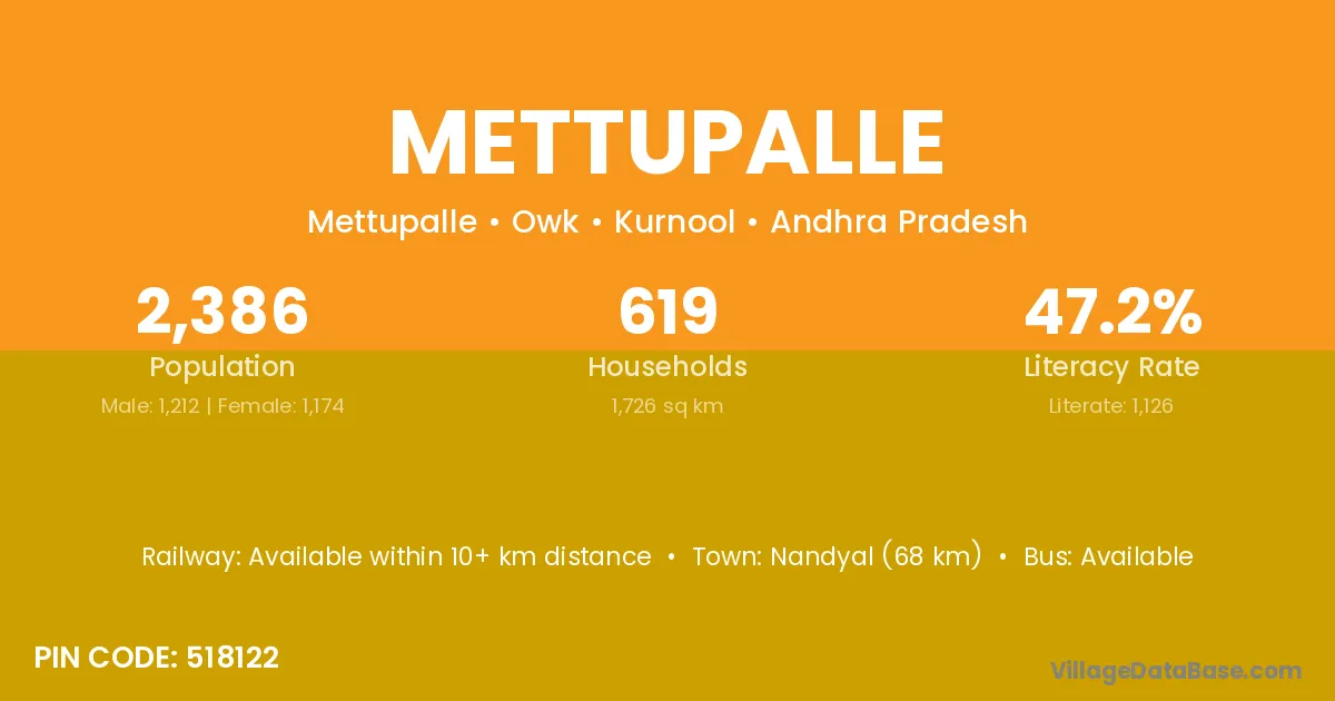 Mettupalle village has a total population of 2,386 people, of which 1,212 are males and 1,174 are females.