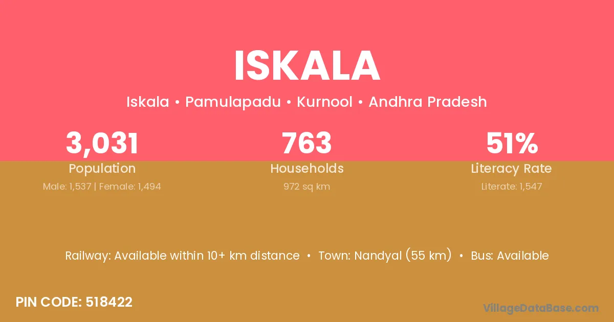 Nandyal (55 km) is the nearest town to Iskala village for major economic activities and is located approximately 55 km away.