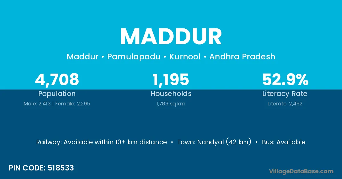 Nandyal (15 km) is the nearest town to Maddur village for major economic activities and is located approximately 15 km away.