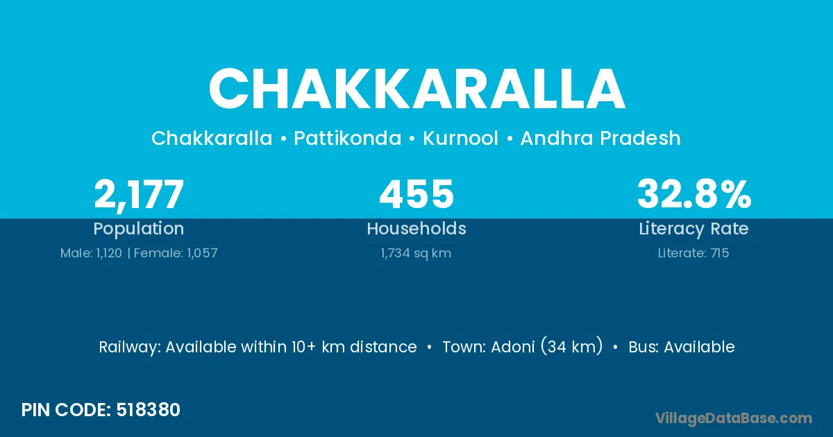 Adoni (34 km) is the nearest town to Chakkaralla village for major economic activities and is located approximately 34 km away.