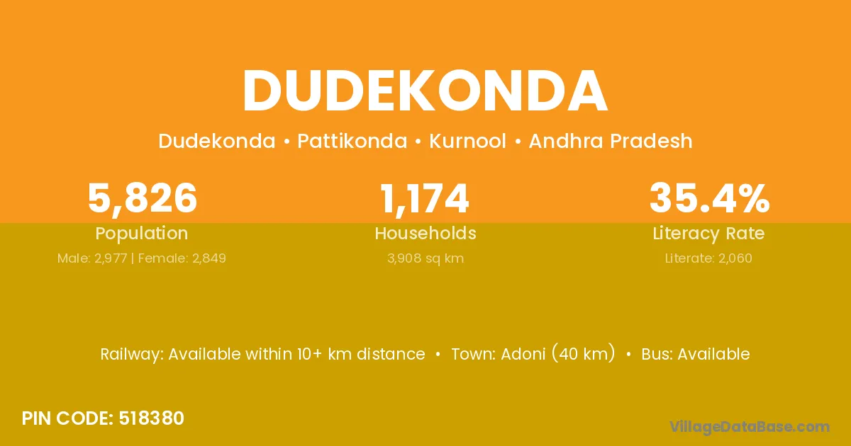 Adoni (40 km) is the nearest town to Dudekonda village for major economic activities and is located approximately 40 km away.