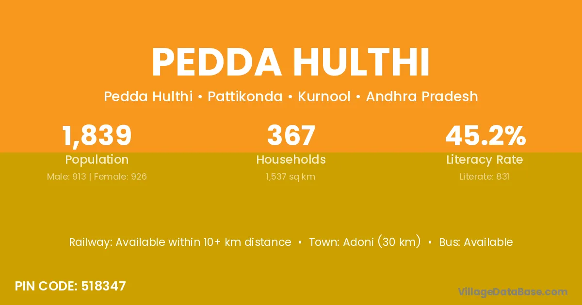 Adoni (30 km) is the nearest town to Pedda Hulthi village for major economic activities and is located approximately 30 km away.