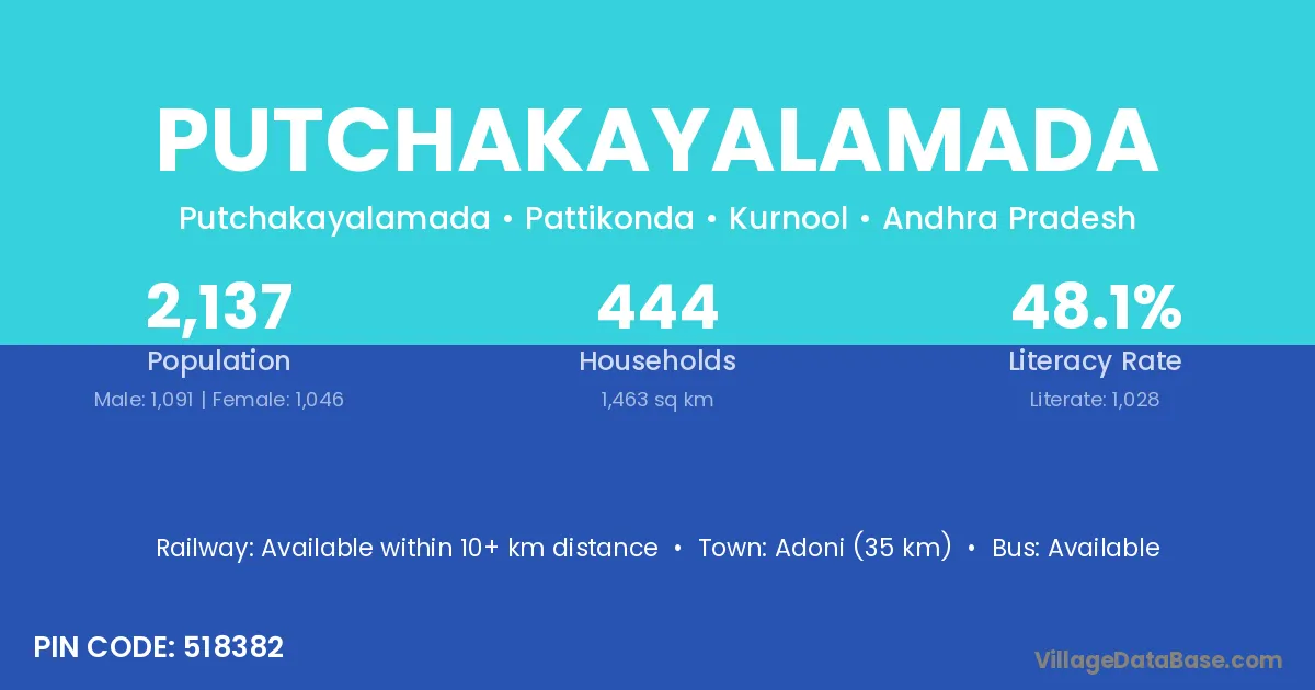 Adoni (35 km) is the nearest town to Putchakayalamada village for major economic activities and is located approximately 35 km away.