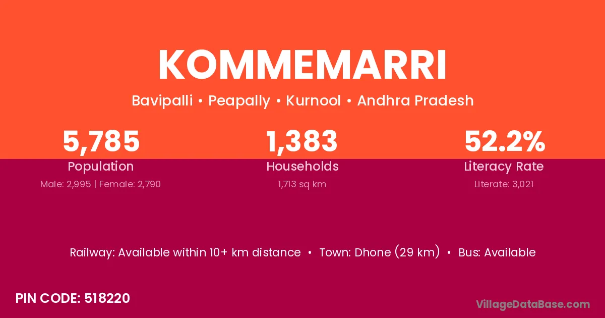 Kommemarri village has a total population of 5,785 people, of which 2,995 are males and 2,790 are females.