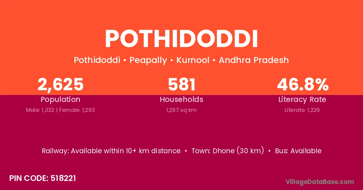 Dhone (30 km) is the nearest town to Pothidoddi village for major economic activities and is located approximately 30 km away.
