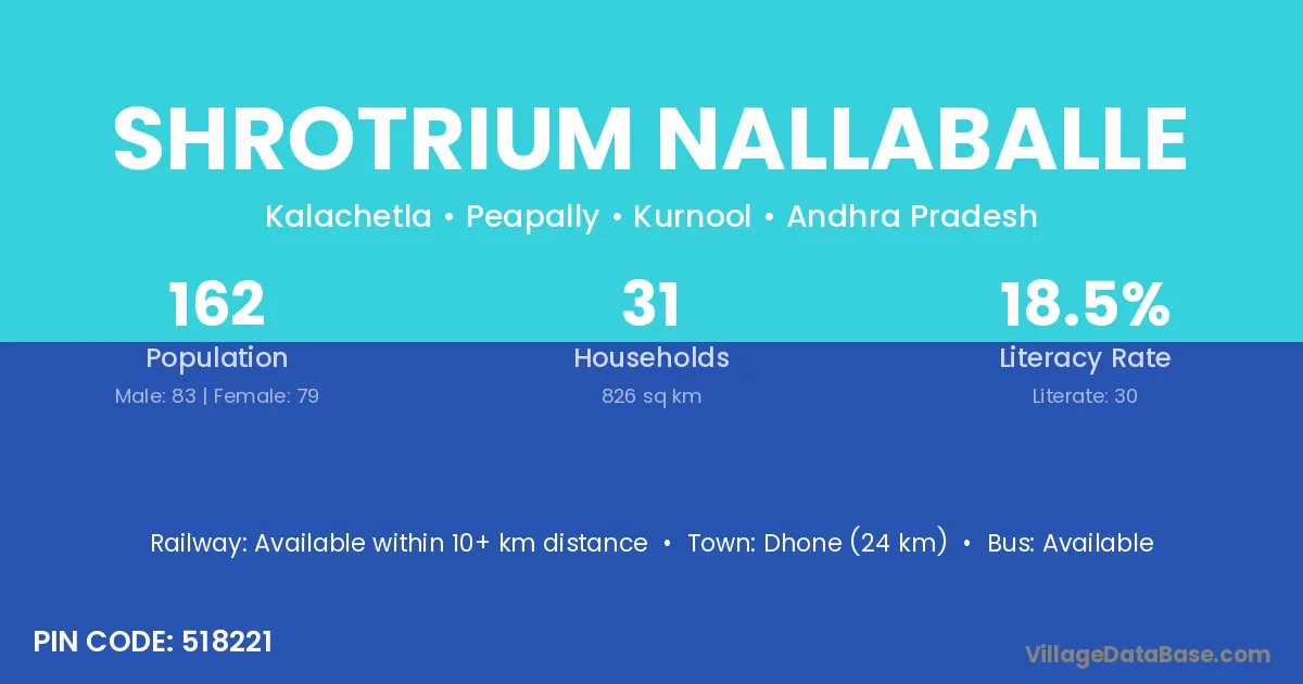 Dhone (24 km) is the nearest town to Shrotrium Nallaballe village for major economic activities and is located approximately 24 km away.