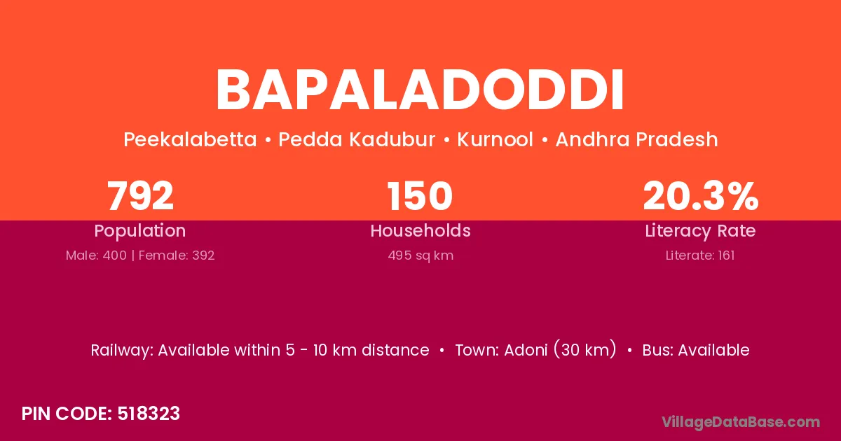 Adoni (30 km) is the nearest town to Bapaladoddi village for major economic activities and is located approximately 30 km away.