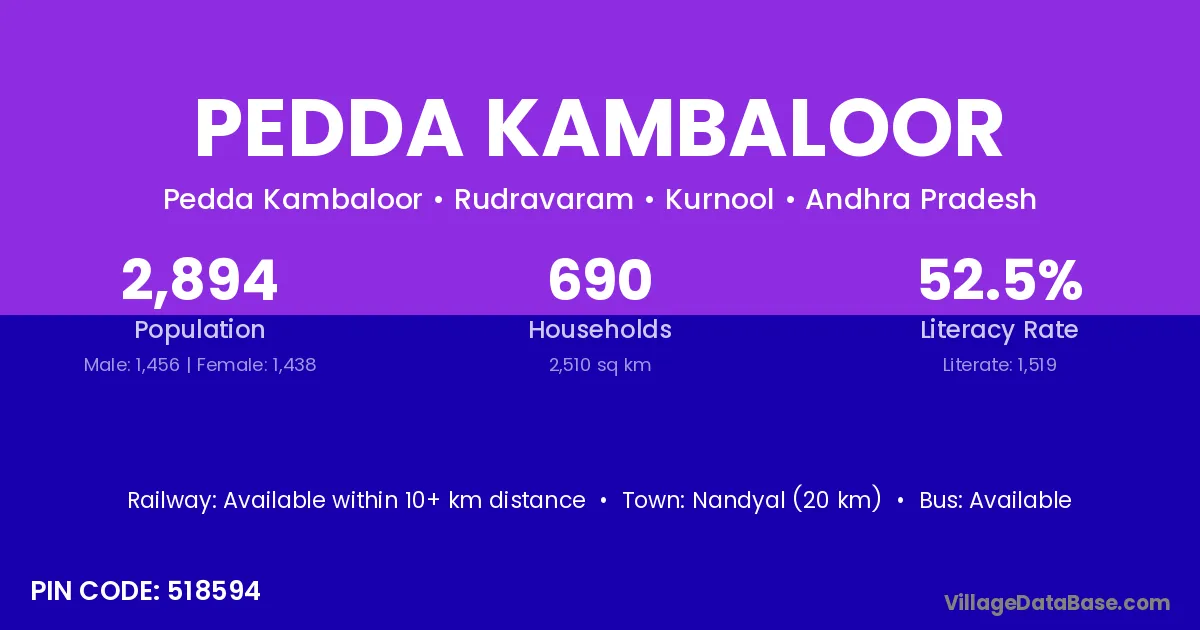 Nandyal (20 km) is the nearest town to Pedda Kambaloor village for major economic activities and is located approximately 20 km away.