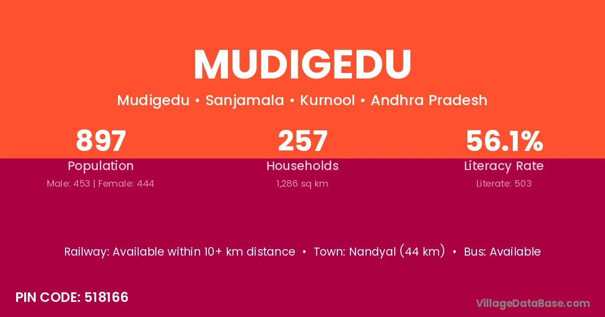 Mudigedu village has a total population of 897 people, of which 453 are males and 444 are females.