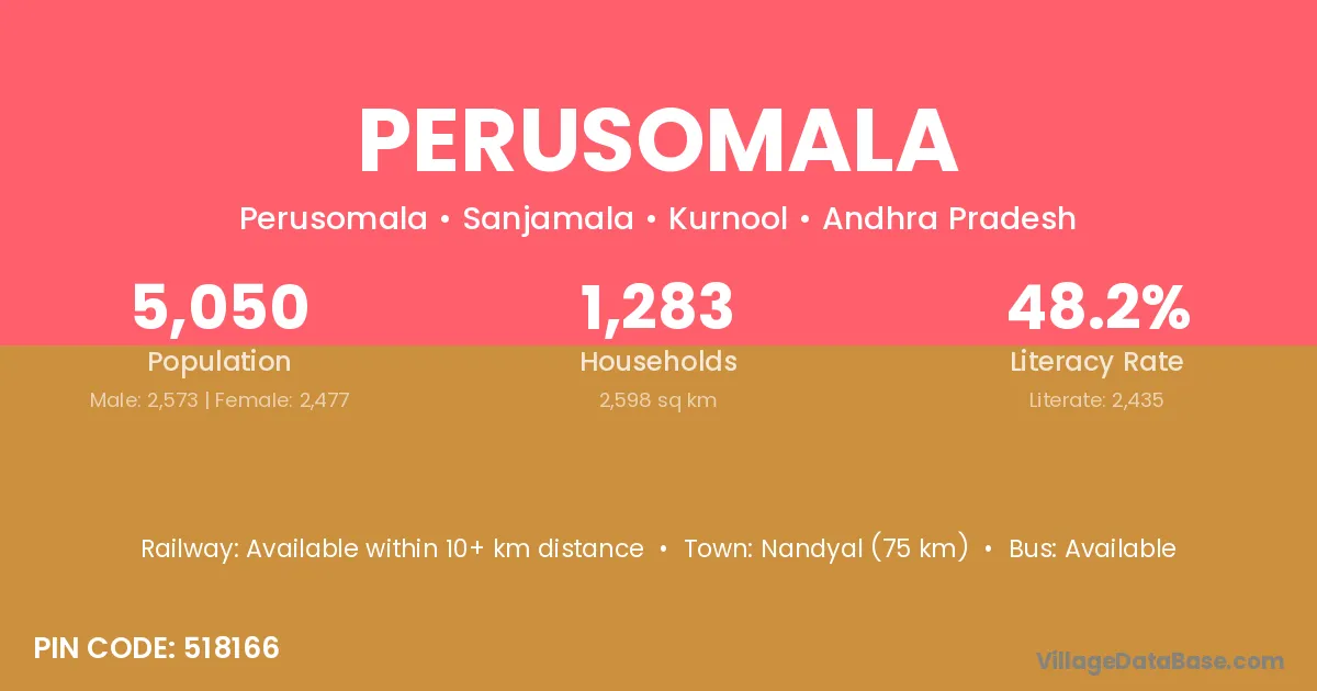 Nandyal (75 km) is the nearest town to Perusomala village for major economic activities and is located approximately 75 km away.