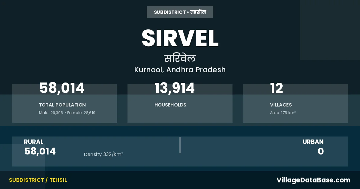 According to the 2011 census The total area of Sirvel Mandal is 175 km², with a population of 58014 people. The population density is 332 inhabitants per square kilometre, and there are approximately 13914 houses in the sub district.