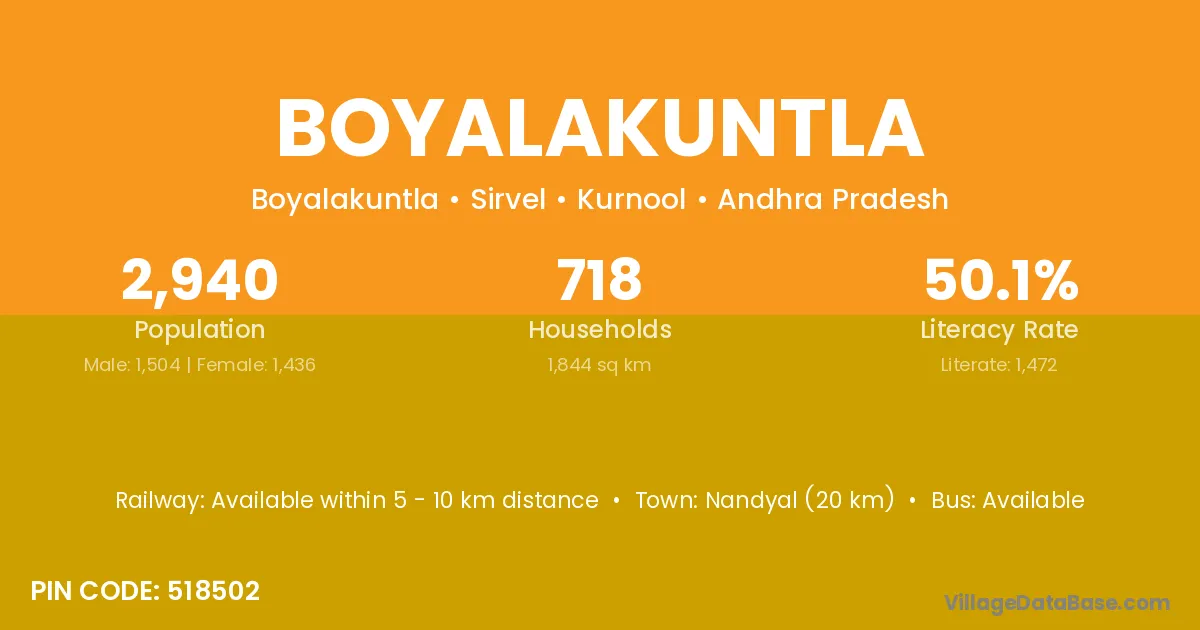 Nandyal (20 km) is the nearest town to Boyalakuntla village for major economic activities and is located approximately 20 km away.