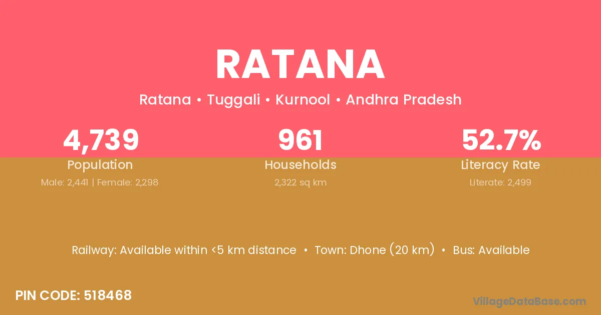 Dhone (20 km) is the nearest town to Ratana village for major economic activities and is located approximately 20 km away.