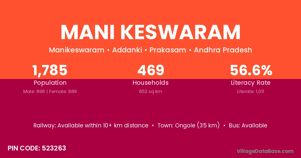 Ongole (35 km) is the nearest town to Mani Keswaram village for major economic activities and is located approximately 35 km away.