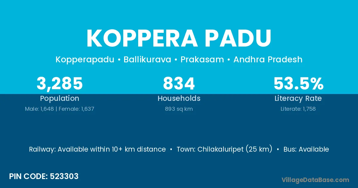 Koppera Padu village has a total population of 3,285 people, of which 1,648 are males and 1,637 are females.