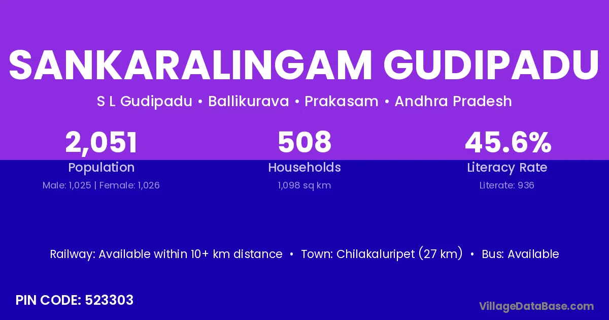 Sankaralingam Gudipadu village has a total population of 2,051 people, of which 1,025 are males and 1,026 are females.