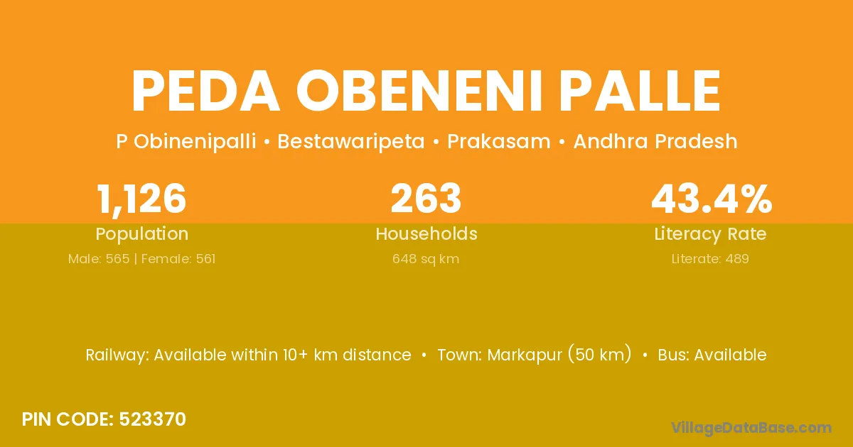 Markapur (50 km) is the nearest town to Peda Obeneni Palle village for major economic activities and is located approximately 50 km away.