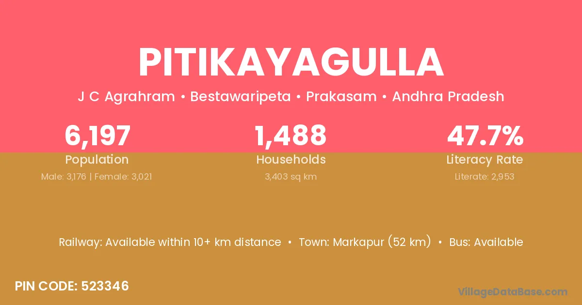 Markapur (52 km) is the nearest town to Pitikayagulla village for major economic activities and is located approximately 52 km away.
